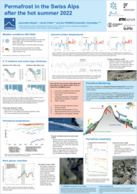 The ground temperatures in the uppermost meters of the permafrost are above average and new records of active layer thickness were measured at many sites. Correspondingly, the permafrost resistivity decreased in summer 2022. However, further down at ca. 10 m depth, the permafrost conditions are still influenced by the colder year 2021 and ground temperatures decreased compared to the previous years. Correspondingly, rock glacier velocity decreased in 2022.