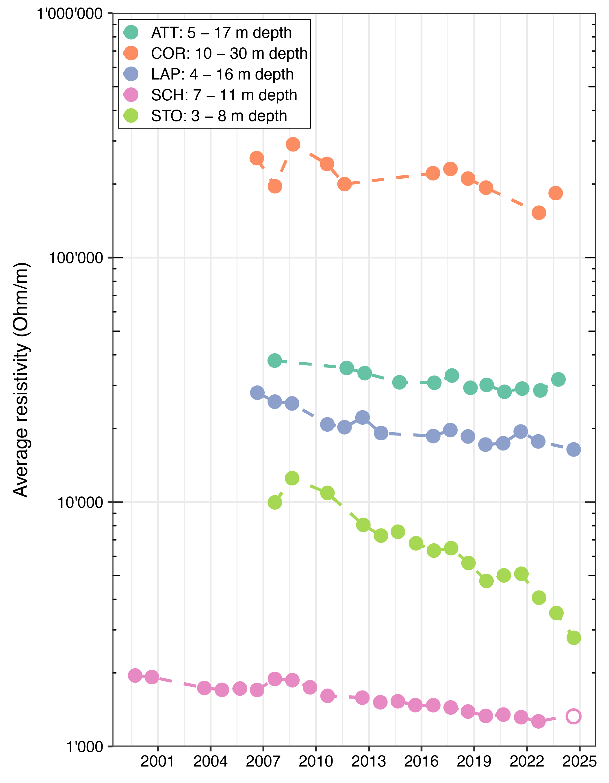 - Morard, S., Hilbich, C., Mollaret, C., Pellet, C., Hauck, C. 2024. 20-year permafrost evolution documented through petrophysical joint inversion, thermal and soil moisture data. Environmental Research Letters, 19, 074074, doi.org/10.1088/1748-9326/ad5571.