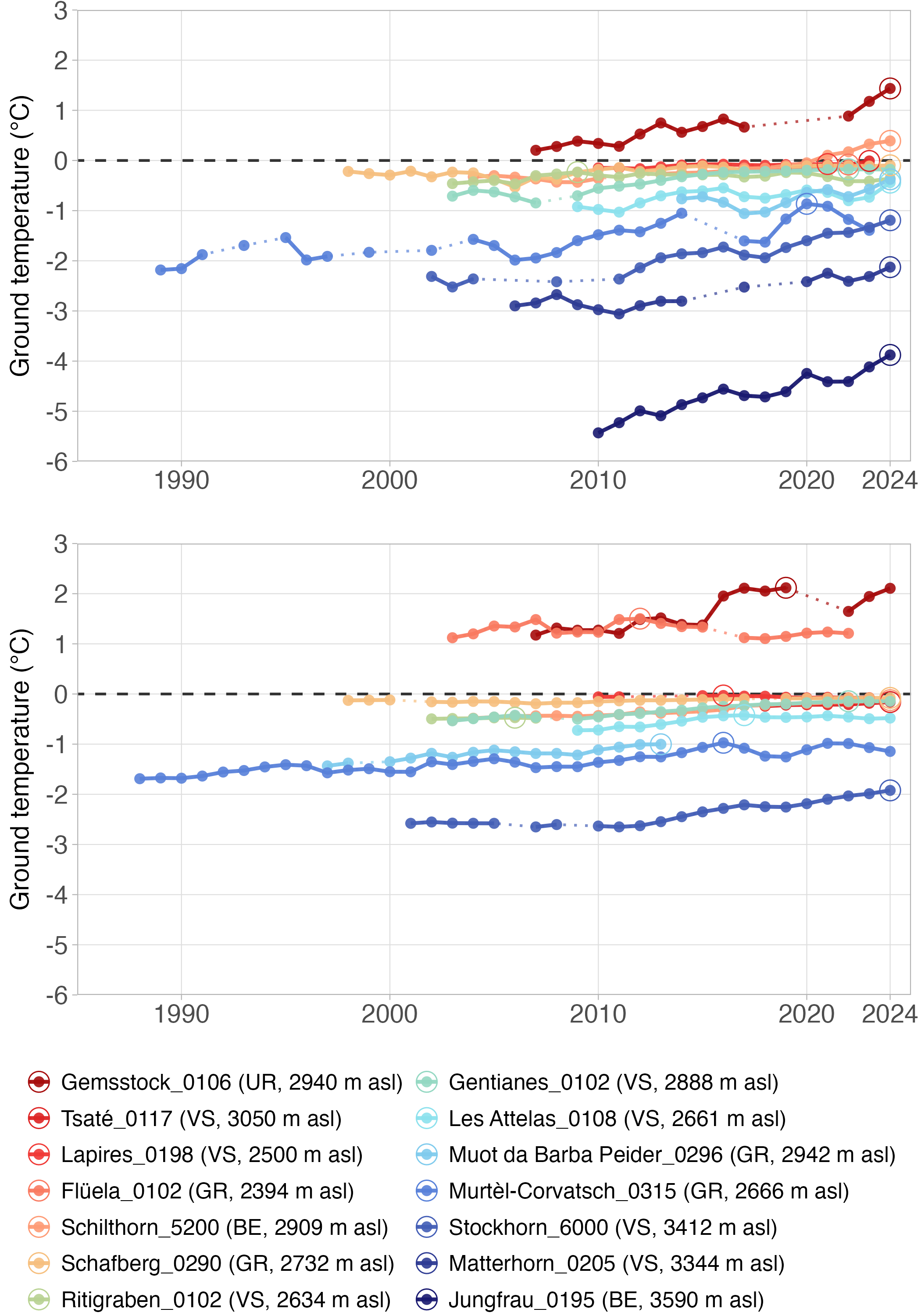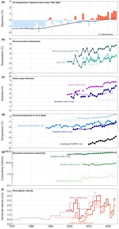 All figures can be downloaded and used freely as long as the PERMOS Network is indicated as the source and the figure caption is used as provided in the slider below. For questions related to the figures, adaptations, or data, contact the PERMOS Office.